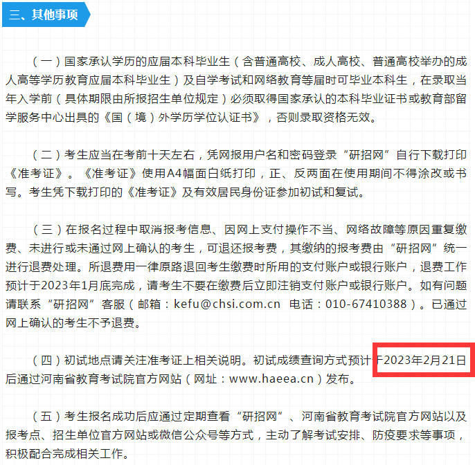 近日从河南教育考试院获悉,河南初试成绩查询方式预计于2023年2月21日后通过河南省教育考试院官方网站(网址:www.haeea.cn)发布。